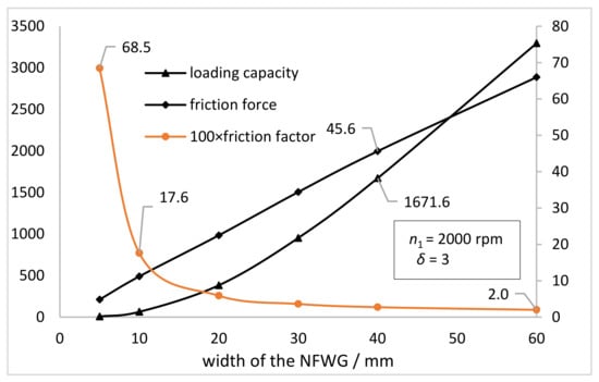 Variations of the loading capacity and friction force and friction factor on the inner wall of the FS with the width of the NFWG (n1 = 2000 rpm, δ = 3).