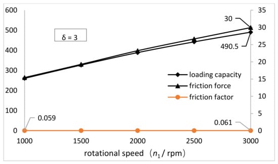 Variations of the loading capacity and friction force and friction factor on the inner wall of the FS with the rotational speed of the NFWG (δ = 3).
