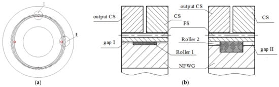 According to the analysis of simulation results, the practical design of the NFWG in pancake harmonic drive is carried out. The NFWG is designed under the optimal elliptical gap ratio, and the gap between the NFWG and the FS is filled with grease. Figure 12a shows the design diagram. Figure 12b shows partially enlarged schematic diagrams at major axis of the NFWG I and at minor axis of the NFWG II. To maintain the gap between the NFWG and the FS and to support the deformation of the FS at rest, the design of embedding cylindrical or spherical rollers of the NFWG is proposed as shown in Figure 12b. The gap between the FS and the NFWG at the minor axis is 3 times larger than that at the major axis, so the rollers at the minor axis are 3 times larger than that at the major axis.