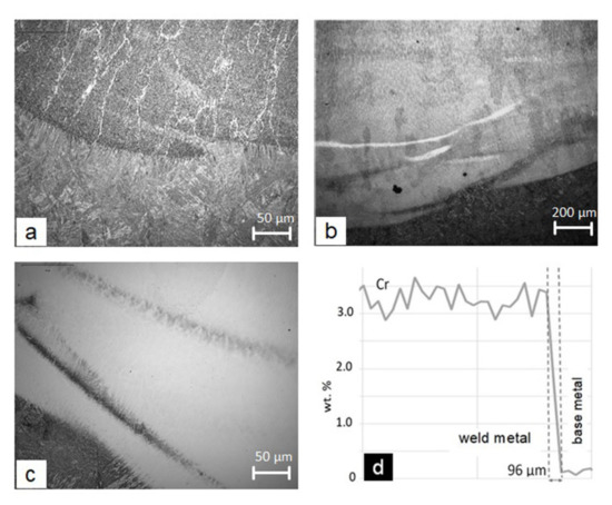 Band-like segregation near the fusion line in surface welds: (a) segregations of the S355 steel in the non-alloyed weld no. 1, where columnar crystal grains are also visible (upper half of figure); (b) dark segregations of the S355 steel and more alloyed light segregation of the filler materials in the low-alloyed weld no. 2 (the light segregation: Cr = 1.4 wt.%, near the segregation: Cr = 0.66 wt.%); (c) dark segregation of the S355 steel in the high-alloyed weld no. 7; (d) the distribution of Cr across the fusion line in the weld no. 3, where the partially mixed zone near the fusion line is clearly visible (the width is 96 μm).