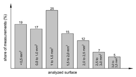 If the SEM operator at the place of the base material segregation analyses too small an area, the estimated admixing rate can be much greater than the real one. Conversely, the admixing rate of the base material will be less than the real one if the SEM operator analyses too small an area with more alloyed filler material segregation or if he/she does not analyze the segregation of the base material at all. Therefore, it is very important that the EDXS analysis of a particular site captures a large enough area of the weld close to the base metal and, at the same time, a sufficiently large area of the well-mixed part of the weld. In order to assess the subjective influence of the SEM operator on the result, a statistical analysis of the size of the measured surfaces of all 84 measurements was carried out. We should mention that, prior to the start of this work, a sketch of the measurement site (Figure 2b) was given to the SEM operator with a note that the analyzed areas should be as large as possible in accordance with the possibilities of the device. Despite the instructions that the analyzed area should be as large as possible, the statistical analysis showed that the surface areas of the measured sites were very different (Figure 4). The prevailing areas were up to 1.5 mm2 (61% of all measurements), while only 12% of the measurements were performed on areas of between 2.5 and 3.5 mm2. On the other hand, three times as many measurements were made on areas ≤1.0 mm2 (36%). The presented statistical analysis shows the possible influence of the SEM operator on the final value of the admixing rate.