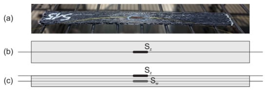 Sample: (a) Photograph and scheme, (b) top view of the sample, and (c) cross-section of the sample; Sz—FBG sensor glued on the surface, Sw—FBG sensor embedded.