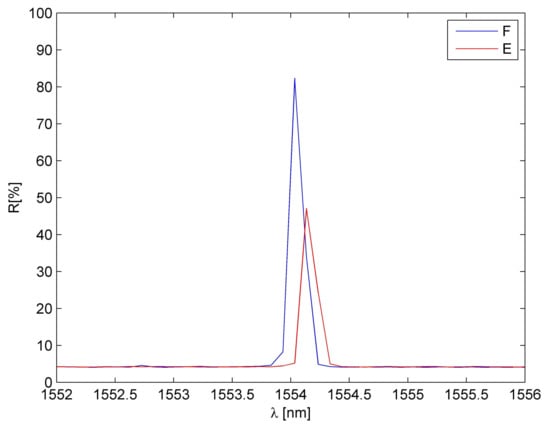 A comparison of FBG sensor spectra: F—free, E—after embedding.