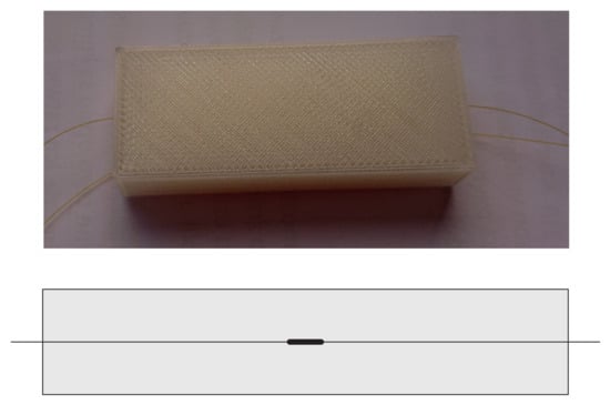 Firstly, the Coefficient of Thermal Expansion (CTE) of the PLA matrix was determined experimentally. It was performed on the sample manufactured under the same manufacturing conditions as the CFRP samples but without adding the fibre reinforcement. The sample dimensions were 50 mm (length) × 20 mm (width) × 10 mm (thickness). In the middle of the sample, an FBG sensor was embedded. The sample photograph and cross-section scheme with marked FBG sensor location is presented in Figure 3.