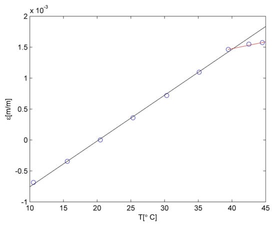 The linear approximation is denoted as a black line in Figure 4. The measurement point for 45 °C is not laying on the same straight line, so a correction was introduced. The observed material behaviour is probably related to the deflection temperature of the PLA material. The detailed discussion related to the temperature influence on the PLA material is presented in []. So, the relationship between strain and temperature for temperatures higher than 40 °C was approximated using linear relationship but with different polynomial constants. The approximation was denoted as a red line in Figure 4. Both polynomials constants are collected in Table 4.