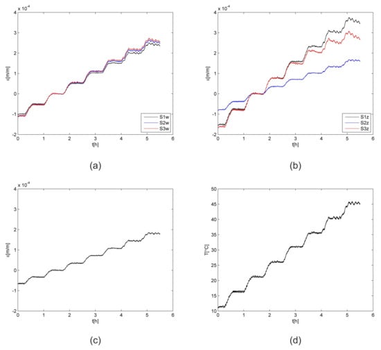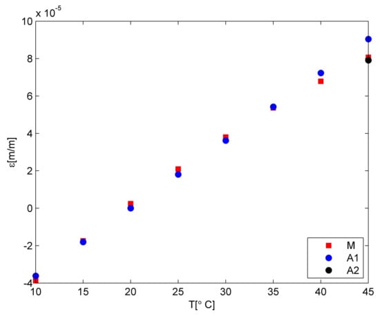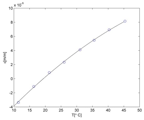 where temperature level is related to averaged temperature value from n points for stable temperature conditions lasting 300 s. The calculation error for temperature was 0.36 °C, whereas that for the strain was 3.6 × 10−6 m/m.