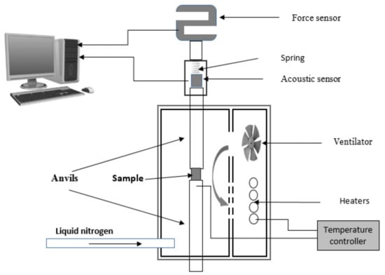 Acoustic emission measurements were performed during compression tests between −60 °C and +90 °C. A schematic of experimental arrangement is shown in Figure 1. The acoustic sensor was connected to the higher anvil. The sample was heated by a resistance tube shaped heating element. The cooling was controlled by pumping liquid nitrogen into the cavity of the heating chamber. The temperature was measured by a copper-constantine thermocouple embedded into the lower anvil quite close to the sample. The whole arrangement was mounted on a Chatillon TCD 225 tensile test console (Ametek Inc., Berwyn, PA, USA) producing a constant deformation rate under displacement control. The original dimensions of the cylindrical tin samples were 3 mm diameter and 3 mm height. After deformation, the height of samples was 1 mm. The acoustic signals were detected by a Micro-100S (Physical Acoustic Corporation, Princeton Junction, NJ, USA) piezoelectric sensor connected by a long steel waveguide to the sample to protect it from the widely variable temperatures (the temperature of the sample can be as low as −60 °C, or as high as 100 °C [32,33]. The setup has a homemade 60 dB grounded base amplifier, with very good transmissibility in the 0 Hz–200 kHz frequency range. The signals were recorded using a National Instruments PCI-6111 multifunction data acquisition board (National Instruments, Austin, TX, USA), with a 5 MS/s/channel sampling rate. In our evaluation program, a filtering was incorporated. Signals between 30 kHz and 1 MHz were further processed.