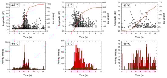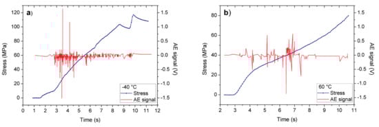 Figure 2a,b shows the applied stress and the emitted acoustic signals, detected simultaneously, as a function of time at −40 °C and 60 °C, respectively. One can see that there is a change in the slope of the plastic part, as well as in the number of acoustic noise hits. For the detection of the acoustic signals, the threshold value was 0.04 V and the hit definition time (HDT) was chosen to be 80 μs well as the AE amplitude was defined as the peak voltage.