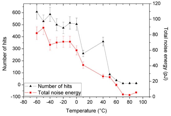 The total number of events and the total noise energy of the deformation process as a function of temperature can be seen in Figure 3. These quantities show again a similar characteristic temperature dependence. The energy of an individual acoustic event, Ei, was determined from the integration of the voltage versus time signal (U(t)) [34,35,36,37]: , where R is a reference electrical resistance [35,36] (taken as 1 MΩ), and Di is the duration time of the event. The total noise energy is given by . It is worth adding that the AE energy shows a definite correlation with the plastic strain energy too [38].
