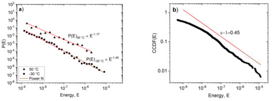 Figure 4 show, as an illustration, the energy probability density functions, PDF, (P(E)~E−ε) at −30 °C and 50 °C, respectively. In our experiments, the parameters of avalanches were collected over the entire stress range during the deformation and thus our histograms and exponents belong to stress integrated values [17,24]. In order to get the exponents from Equation (1), the PDF functions (calculated using logarithmic boxing) were fitted using a three parametrical nonlinear fitting by the Levenberg-Marquardt least squares method. In Figure 4b, the complementary cumulative distributions, CCDF, are also shown for comparison. It can be seen that the PDF is a nice straight line over three orders of magnitude of E. In addition, in Figure 4a,b the slopes of the two (PDF and CCDF) functions provide the same values ε = 1.45 ± 0.05 and 1.20 ± 0.15 (In Figure 4b the straight line just indicates the slope fitted according to the power law, and its value should be less by 1 than the slope of the PDF [39].) We also checked that the exponents estimated from the maximum likelihood fitting [40] agreed well, within the error bars, with those calculated from the PDF and/or CCDF (see also Figure 4c and the comments in Section 3.4 below). Similarly to (P(E)) from the size distribution functions (P(S)~S−τ) τ = 1.9 ± 0.1 and τ = 1.0 ± 0.3, values were obtained at low and high temperatures, respectively (see also Table 1).