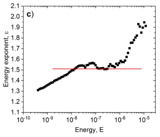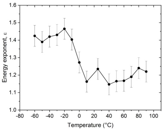 Figure 5 shows the temperature dependence of the characteristic exponents of the energy distributions ε. It can be seen, that the energy exponent has a transition from ε = 1.45 ± 0.05 to ε = 1.20 ± 0.15 as the temperature increases from low values (below −20 °C) to high temperatures (above 50 °C).