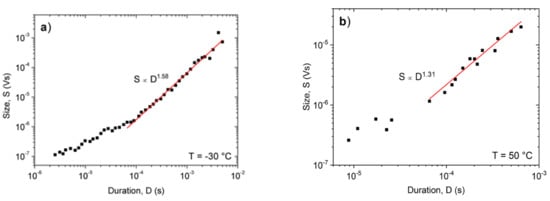 Figure 7 shows the S versus D plots at −30 °C and +50 °C. It can be seen that again the scatter is larger in Figure 7b, by a similar reason as it was in Figure 4a (much smaller numbers of hits at low temperatures: see also Figure 3). Nevertheless, it is clear that the exponents, γ are also different at high and low temperatures (γ = 1.56 ± 0.05 and 1.3 ± 0.1). Furthermore, the first parts, belonging to small values of D in Figure 7, are out of the region where the power fitting was made. The reason of this can be twofold: (i) these small values of S and D are sensitive to the choice of the threshold; and (ii) the effect of intrinsic absorption of the AE signal [29,30,31]. Indeed, it was shown in [29] that the signal intensity (defined as I(t) = U2(t)) is influenced by an exponential decay due to intrinsic absorption factor, exp(−t/τa), where τa is the characteristic time of absorption, and it was concluded that for short events (D < τa) the AE duration is meaningless in terms of source mechanism [29]. On the other hand, it is expected that in the D >> τa limit the above distortion effect of the transfer behavior of the system can be moderate or even negligible [30,48,49]. From our plot in Figure 7a, the time limit above which this effect can be neglected is about 100 μs (in [29] it was found that this value was also about 100 μs in a concrete material). In a very recent paper [31] the distortion effect of the acoustic emission device was nicely summarized. While the distortion effect considerably modified the duration time and the exponents of the scaling functions such as (2) at small parameter values (as it also can be seen in our Figure 7a), the exponents of the PDF functions of the energy and size were approximately invariant (i.e., their values were the same for the source signals and the measured voltage). This confirms that our results on the temperature dependence of exponents summarized in Table 1 reflect the changes due to the change of the deformation mechanisms.