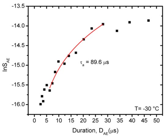 Figure 8 illustrates that the first part of the function (see Figure 7a) indeed can be fitted by Equation (5) (in the following only low temperature measurements (−30 °C) will be analyzed due to the much better statistics of the data obtained), and the fitted curve provides τa = 90 μs. We can similarly investigate, for example, the relations between AAE and DAE (see Figure 9).