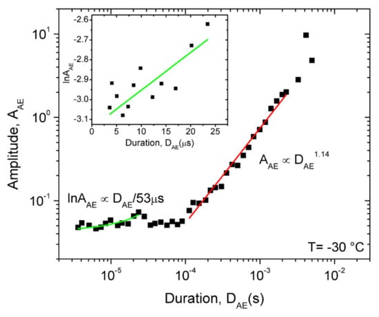 Relation between AAE and DAE at −30 °C. The straight red line fitted at large values of DAE has the slope (in accordance with Equation (3)) i.e., γ = 1.88 (see Table 3 as well). From the green curves fitted at short durations (see the insert as well, which show the lnAAE versus DAE function) τa = 50 μs was obtained.