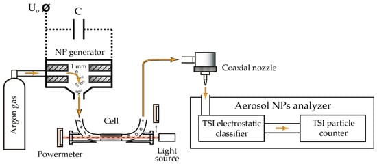 In all the experiments, the laser was initially set up at the position of the light source in front of the cell so that the radiation was directed opposite to the aerosol flow. The gas flow rate used (Q = 50 mL/min) determined the velocity of NPs inside the cell υ = 117.9 mm/s. The diameter of the laser beam in the cell was 3 mm. The study of the laser radiation interaction with NPs was done under the control of the average radiation power by the thermal power meter PD300-3W-V1 (Ophir, North Logan, UT, USA). The energy density of a single laser pulse was calculated based on the measured average radiation power and known pulse repetition rate, provided that the laser generates the same pulses [11].