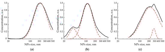 Examples of size distributions for initial (a) and laser modified (b,c) NPs agglomerates (black curves) with their log-normal multiple peak approximation (dashed red curves). Here, the NPs size axis is provided in the logarithmic scale.