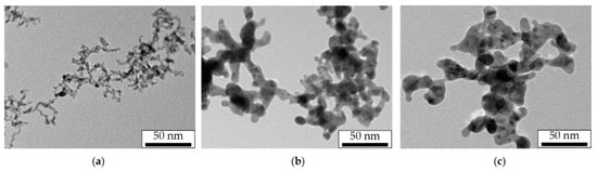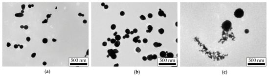 The morphology of NPs modified by laser radiation at the maximum pulse energy density and pulse repetition rate of 500 Hz is shown in the TEM images presented in Figure 5. Under the close sintering conditions, the Pt and Au agglomerates were completely sintered, which is confirmed by the large spherical NPs in Figure 5a,b. However, for Ag, one can see dendritic structures in the TEM images (Figure 5c), which characterize the sintering as incomplete.