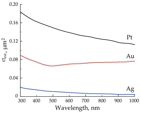 Extinction cross-section spectra of a single NP averaged over the flow of initial agglomerates for Pt, Au and Ag.