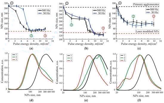Dependencies of Pt (a), Au (b) and Ag (c) NPs size at the output of the focusing nozzle right after the cell on the pulse energy density of laser radiation with the wavelength of 1053 nm at the pulse repetition rate of 500 Hz and the aerosol flow rate of 50 mL/min. The shrinkage curve data for Au is from [11]. Size distributions of initial and laser modified Pt (d), Au (e) and Ag (f) NPs agglomerates taken from 1, 2 and 3 measurements presented in (a–c).