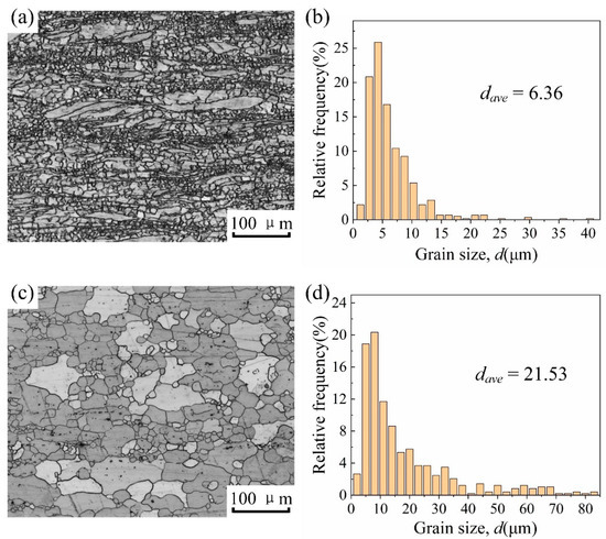 The optical microstructures and grain size distribution of the two metals are shown in Figure 1. The metallographic micrograph of ZK60 shows both very fine equiaxed grains and coarse lath-shaped grains, as shown in Figure 1a; while the metallographic micrograph of ATZ511 shows uniform equiaxed grains with a few coarse equiaxed grains, as shown in Figure 1c. Over 500 grains were measured using Nano Measurer software according to the equivalent circle diameter of the grains, and the statistical results are shown in Figure 1b,d. The grain size of both BMs shows a bimodal distribution. The average grain size of ZK60 (6.36 μm) is significantly smaller than that of ATZ511 (21.53 μm).