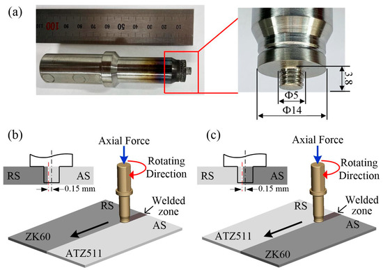 The welding experiments were carried out on a FSW machine with 10 KW maximum power manufactured by Harbin Hafei Welding Equipment Company (Harbin, China). A self-designed rotation tool made of H13 steel was used, and its shape and dimensions are shown in Figure 2a. The tool was designed with a shoulder diameter of 14 mm, a pin diameter of 5 mm, a pin length of 3.8 mm, and a 1 mm pitch right-hand threaded cylindrical profile on the pin. The welding speed and the rotation rate were optimized in the preliminary work, and according to the optimization results, the FSW was carried out at a tool traveling speed of 75 mm/min and a rotation rate of 1500 rpm. In addition, tool pin offset to the AS by 0.15 mm, and tilt angle was set as 2.5 degrees. Two types of BMs arrangements were performed for dissimilar FSW, as illustrated in Figure 2b,c. The rolling direction of ZK60 and the extrusion direction of ATZ511 are paralleled to the welding direction. The sample obtained by placing ZK60 on the advancing side and ATZ511 on the retreating side is named ZK60/ATZ511 joint; on the contrary, the sample obtained by placing ATZ511 on the advancing side and ZK60 on the retreating side is named ATZ511/ZK60 joint.