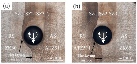In summary, there is no significant difference in grain size within SZ of the joints with two types of arrangements, except for the differences in alloys distribution caused by material flow and transfer. The grain size of the ZK60 within SZ increased slightly, while the grain size of the ATZ511 within SZ decreased significantly.