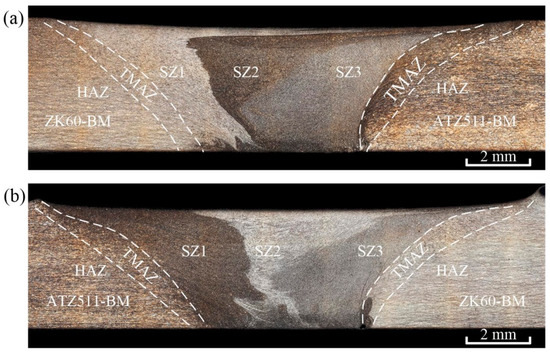 Typical optical microstructures of the three stirring subzones of the both joints are illustrated in Figure 6. The SZ1 in the ZK60/ATZ511 joint and the SZ2 in the ATZ511/ZK60 joint have similar microstructure morphology, because they are both transferred from ZK60 BM, as shown in Figure 6a,e. In the same way, the SZ2 in the ZK60/ATZ511 joint and the SZ1 in the ATZ511/ZK60 joint have similar microstructure morphology, because they are both transferred from ATZ511 BM, as shown in Figure 6b,d. The SZ3 of both joints has a common distribution of homogeneous microstructure compared to other regions, as shown in Figure 6c,f. Due to the combination of drastic plastic deformation and severe thermal exposure during FSW process, the material in SZ of FSW joint experienced adequate dynamic recrystallization (DRX) [11,30]. As a result, the uniformly distributed microstructure of the SZ materials of FSW joint replaced the treatment (as-rolled or as-extruded) microstructure of original BMs.