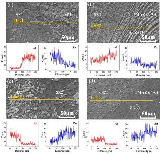 In order to further investigate situation of the above two interfaces (the interface between SZ1 and SZ2, the interface between SZ and TMAZ on the AS) being clearly seen, EDS line scans were performed on these areas. The scanning results of FSW joints with two types of material arrangement are shown in Figure 5. The main alloying elements of the two magnesium alloys diffuse into each other at a distance of about 50 μm at the interface between SZ1 and SZ2, as shown in Figure 5a,c. From the leading side of rotating pin to the weld wake, the original faying surface experienced a consecutive plastic extrusion and a sufficient thermal history during FSW process. This process provided an adequate driving force for elemental diffusion. Additionally, the results of Luo et al. [6] showed that no intermetallic compounds are formed at the interface of two dissimilar alloys. This indicates that the original faying interface formed a fine metallurgical bond by FSW. The Zn element content of the SZ3 of the both joints is higher than that of ATZ511 BM, as shown in Figure 5b; while the Al element content of the SZ3 of the both joints is higher than that of ZK60 BM, as shown in Figure 5d. Thus, this confirms that the metal of SZ3 mentioned earlier is a mixture of two base materials. The mixed zone of dissimilar materials has also been reported in Ref. [29]. Furthermore, there is a phenomenon of elements inter-diffusion at the interface between SZ3 and TMAZ on AS, which is attributed to the high residual heat after welding and severe extrusion of the tool shoulder. However, the elements diffusion at the interface between SZ3 and TMAZ is limited when ZK60 is placed at AS. This may be due to that ZK60 with superior plasticity caused a greater material flow rate around the tool pin, and a narrower TMAZ was created at the AS.