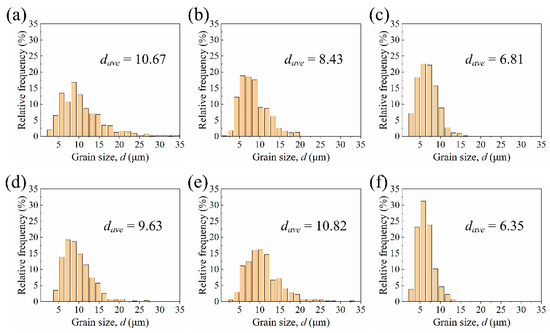 Grain size distributions in various stirring sub-zones of the two welded joints: (a) SZ1, (b) SZ2, (c) SZ3 of the ZK60/ATZ511 joint; (d) SZ1, (e) SZ2, (f) SZ3 of the ATZ511/ZK60 joint.