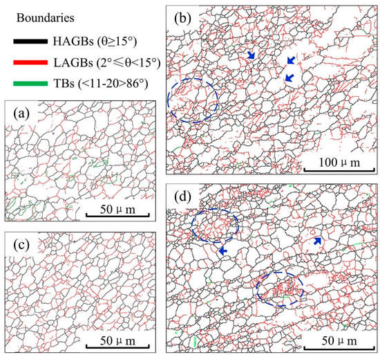 The microstructure evolution of both the ZK60/ATZ511 joint and the ATZ511/ZK60 joint follows a number of common trends. To a certain extent, the grain boundary characteristics of the TMAZ can reflect the evolution of the microstructure and the grain subdivision process [28,34]. It is known that the refinement and the homogenization of grains within the SZ of magnesium alloys during the FSW process are mainly attributed to the adequate DRX [23,27,35]. Figure 8 shows the details about the transformation of grain structure. The twin boundary is relatively rare in TMAZ at AS, because this area is very close to the tool pin and the heat may promote the activation of dislocation slip [11,12]. There are a large number of strain-induced low-angle grain boundaries (LAGBs) in the TMAZ at the AS, which are caused by the accumulation of dislocations of the initial grains, and gradually transform into high-angle grain boundaries (HAGBs), as shown by the circles and the arrows in Figure 8b,d. This reveals the grain subdivision process to a certain extent. Accordingly, grain structure evolution is dominated by continuous DRX [34]. It should be noted that the observation area is very close to the tool, and relatively far areas such as the outer boundary of TMAZ may have the twinning mechanism or discontinuous DRX. The continuous DRX and discontinuous DRX have been well described in references [11,28,34]. The observed grains in the SZ3 of the both joints are recrystallized and characterized by low-aspect-ratio DRXed grains, as shown in Figure 8a,c. This observation agrees well with those reported in references [13,19,30].