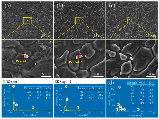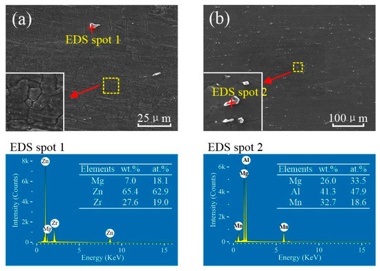 Figure 9 shows the distribution of precipitate particles and EDS scanning results of the two BMs. Most of the microstructure of the ZK60 BM exhibits that the extremely fine precipitate particles diffusely distributed in the magnesium matrix except for a few coarse particles of about 1 to 5 μm in size. The EDS point scanning result shows that these precipitate particles are rich Mg-Zn-Zr compounds, as shown in Figure 9a. Generally, two types of precipitates include in ZK60 Mg, namely Mg-Zn particles (mainly MgZn2) and Zn-Zr particles (most likely Zr2Zn3) [15,36]. The precipitate particles of the ATZ511 BM have a large size with about 1–3 μm, and mostly precipitated along grain boundaries. The EDS point scanning result shows that these precipitate particles are rich Mg-Al-Mn compounds, as shown in Figure 9b.