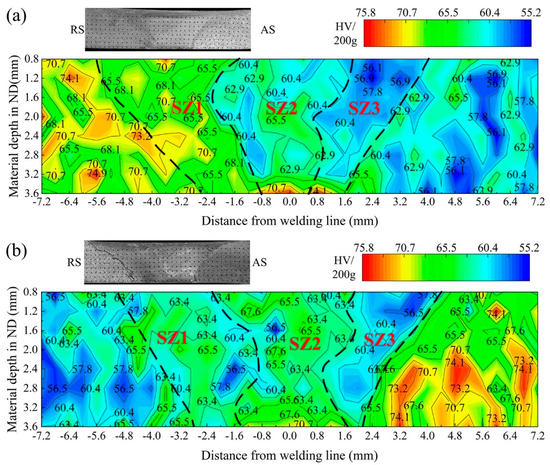 Hardness profile at the cross-section of the two welded joints: (a) the ZK60/ATZ511 joint; (b) the ATZ511/ZK60 joint.