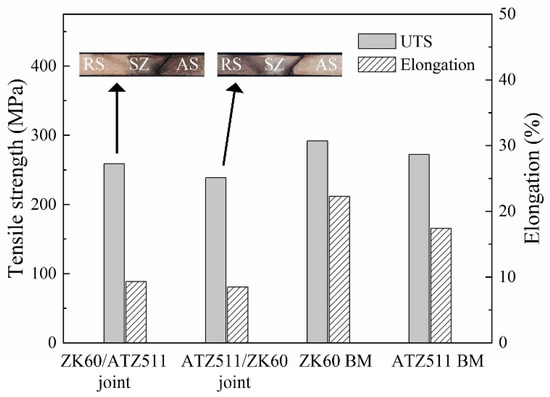 Figure 12 presents ultimate tensile strength (UTS) and elongation of the joints and the BMs. The UTS of both the ZK60/ATZ511 joint (259 MPa) and the ATZ511/ZK60 joint (238 MPa) was slightly lower than that of both the ZK60 (292 MPa) and the ATZ511BM (272 MPa), while the elongation of the both joints (9.3 and 8.5%) was significantly lower than that of the two BMs (22.3% of ZK60 and 17.4% of ATZ511). The UTS of both joints reached 95 and 88% of the ATZ511 BM, respectively. The fracture locations of both welded joints are located at the boundary between the SZ and the TMAZ on the AS all. The fracture behavior is mainly influenced by the contrasting microstructure between the SZ and the TMAZ. In addition, it is obvious that the welding efficiency of the joint obtained with ZK60 placed on the RS is slightly better than that of the joint obtained with ZK60 placed on the AS. This may be due to that the non-uniform distribution of the microstructure near the boundary between the SZ and the TMAZ is attenuated when the ZK60 with superior plasticity is placed on the RS.