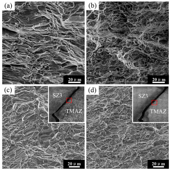 Figure 13 shows the tensile fracture surfaces of the BMs and the welded joints. The fracture morphology of the BMs (ZK60 and ATZ511) mainly exhibits a lot of clear dimples and tearing fibers. The presence of larger size dimples on the fracture surface of ZK60 compared to ATZ511 indicates that ZK60 has relatively better plasticity. The fracture surfaces located on TMAZ (as shown in the red dashed frames of the upper right insets of Figure 13c,d) of both welded joints show a fracture characteristic of quasi-cleavage, which is characterized by the formation of flat cleavage facets and tearing edges, as presented in Figure 13c,d. There is no significant difference between the fractures of the two joints except for the difference in the shape of the cleavage facets. As a result, there is no significant effect of the materials’ arrangement on fracture behavior, and a brittle failure more likely to occur in the friction stir-welded joints. This may result in the low elongation of welded joints in transverse tension.