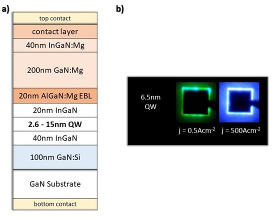 The InGaN LEDs were grown by plasma assisted molecular beam epitaxy (PAMBE). The growth of LEDs presented in this paper was conducted either in a VG V90 or a Veeco Gen20A rectors. Both of the reactors were equipped with two Veeco RF plasma sources in order to change the growth rate quickly. The growth of GaN layers was conducted at 730 °C in gallium-rich conditions with a growth rate of 0.36 µm h−1, while InGaN layers were grown in indium-rich conditions at 650 °C with a higher growth rate of 1 µm h−1. The higher growth rate in the case of InGaN was used to ensure a better optical quality of the QWs []. Further details of the PAMBE technology can be found in Ref. [], while the InGaN growth model can be found in Ref. []. The structures were fabricated on freestanding GaN substrates with the threading dislocation density in the order of 107 cm−2. All structures start with a 100 nm GaN doped with Si. Next, an undoped 40 nm In0.02Ga0.98N layer was grown followed by an In0.17Ga0.83N single QW with thickness equal to 2.6, 6.5, 7.8, 12 or 15 nm. This was followed by 20 nm undoped In0.02Ga0.98N and a highly doped 20 nm Al0.13Ga0.87N:Mg electron blocking layer (EBL). Next, the 200 nm p-type GaN:Mg and 40 nm In0.02Ga0.98N:Mg were grown. Lastly, a highly doped 5 nm In0.14Ga0.86N:Mg was grown to act as a contact layer. The doping concentrations were 2 × 1018, 3 × 1019, 1 × 1018, 2 × 1019, and 1 × 1020 cm−3 for the GaN:Si, EBL, GaN:Mg, In0.02Ga0.98N:Mg and In0.14Ga0.86N:Mg contact layers, respectively. A schematic of the grown structures is shown in Figure 1.