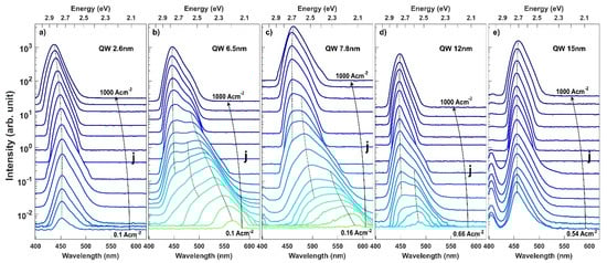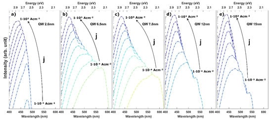 In Figure 7, the calculated emission spectra of LEDs with QW thickness ranging from thin 2.6 nm to very wide 15 nm are presented for various current densities. For the thin QW (Figure 7a) the emission spectra are blue shifted with the current density due to the screening of the polarization charges and the band filling effect. For the intermediate QW thickness of 6.5 nm and 7.8 nm, multiple peak emission spectra can be seen in Figure 7b,c, with the peak wavelength reaching the green-yellow regime. Depending on the current density, different transitions have the highest intensity as can be seen in the case of the 7.8 nm wide QW. The emission evolves to a single peak emission from the <e2h2> transition for high drive currents densities, when all lower states are occupied and the internal electric field is strongly screened.