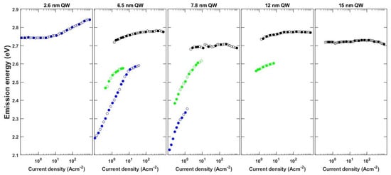 We performed the experimental study of the EL spectra of the InGaN based LEDs in order to understand the recombination mechanism. The collected spectra are presented in Figure 2. In the case of LEDs with 6.5, 7.8 and 12 nm, we observed multiple peaks, which strongly shift and change their relative intensity with the supplied current. In order to better present this complex behavior, we extracted the dependence of the position of each peak on current density and show it in Figure 3. Based on the differences in the behavior we can group the LEDs into three categories: (i) thin QW–LED with 2.6 nm, (ii) intermediate QW–LED with 6.5 and 7.8 nm, and (iii) wide QW–LEDs with 12 and 15 nm.