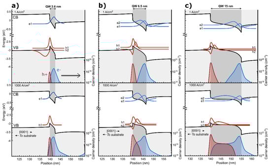 In order to understand the recombination mechanism behind the complex behavior of the experimentally observed emission spectra, we performed the simulations of grown samples. Selected band profiles and wavefunctions together with the carrier distribution of the LEDs with thin, intermediate and wide QWs are shown in Figure 4a–c, respectively. Two cases are presented to discuss the LED operation in two extreme regimes: (i) low current density j = 1 A cm−2, and (ii) high current density j = 1000 A cm−2. In the low current density regime, the electrons and holes are spatially separated as a result of the built-in polarization fields. This separation is more evident for QWs with larger thickness. In the case of the intermediate and wide QWs, the built-in electric field is already partially screened by the large carrier density confined at the edges of the QWs.