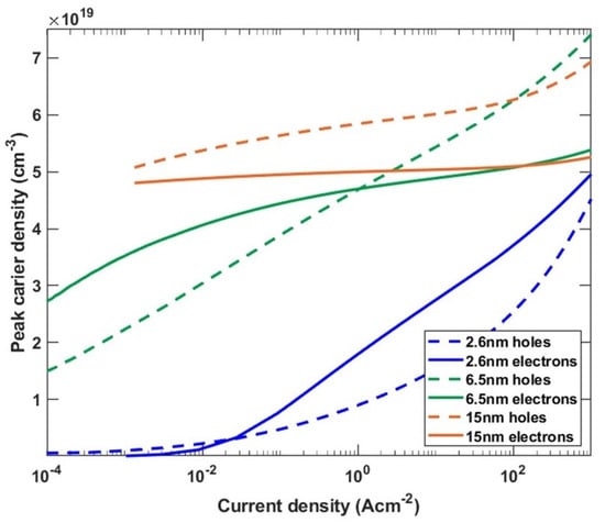 The dependence of the carrier density located at the edges of the QW on current density, shown in Figure 5, is what clearly distinguishes the three regimes of the QW thickness. It is important to note that the values plotted in Figure 5 are the peak maxima of the separated electron and hole distributions. This dependence is presented to discuss the process of screening of the built-in field. In case of the thin QW, both the electron and hole densities are low in the low current regime and start to slowly rise as the current is increased. In the case of the intermediate QWs, the carrier density rises very rapidly already in the low current density regime. In contrast, in the wide QW, there is a large carrier density, even at very low currents, and there is only a slight increase at high currents. At the carrier densities observed in the intermediate and wide QWs, the excited states start to be occupied and play a significant role in carrier recombination.