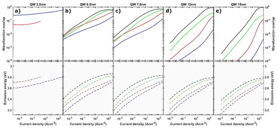 Calculated dependence of wavefunction overlap and peak wavelength emission of various states inside the QW on current density. The QW thickness varies from (a) 2.6 nm, (b) 6.5 nm, (c) 7.8 nm, (d) 12 nm and (e) 15 nm.