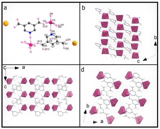 The single crystal diffraction-based structure solution and refinement of K26dcpa were achieved using SHELXS-97 and SHELXL-2013 programs [24]. The difference Fourier maps were used to determine the location of hydrogen atoms. For all non-hydrogen atoms, refinement of anisotropic displacement parameters was performed. The initial analysis of powder diffraction data (indexing, space group determination) was carried out using the Expo 2014 program [25]. In addition, Expo 2014 managed to locate heavy atoms (Mo and K atoms) using direct methods. An organic molecule of 3,5-dicarboxylicpyridine acid N-oxide was located using the FOX program (direct space methods) [26]. Jana 2006 [27] was used to perform the restrained Rietveld refinement. The final Rietveld refinement plot for K35dcpa is presented in Figure S1 in the Supplementary Materials (S). Detailed crystal structure data for K26dcpa and K35dcpa are presented in Table 1. For the visualization of the crystal structures of the obtained compounds, the Diamond [28] program was used.