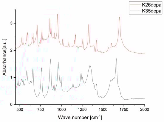 IR spectra of the compounds K26dcpa and K35dcpa. N-oxide and Mo-N vibrations listed in Table 3.