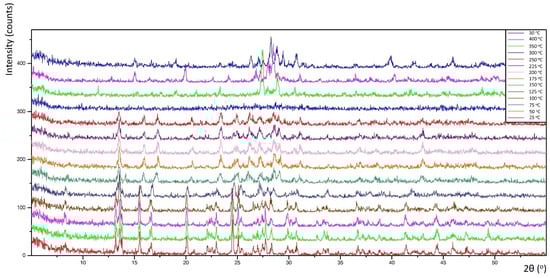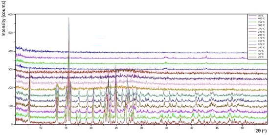 Thermal decomposition investigations were carried out to reveal the relation between thermal stability and molecular structure. Obtained diffractograms (non-ambient XRPD) verified the stability of the K26dcpa compounds up to 125 °C and K35dcpa compounds up to 75 °C. For K26dcpa, gradual decomposition was observed in the 150–250 °C range. The amorphous phase was observed at 300 °C. Subsequently, potassium molybdate phases were detected [pdf-4+ 00-023-0489]; [pdf-4+ 00-021-0663]. These phases (K2MoO4 and K2Mo2O7) were stable after cooling the studied sample to 30 °C (Figure 4). In the case of K35dcpa, gradual degradation was observed in the 100–150 °C range. Above these temperatures, the compound decomposed to an amorphous phase (Figure 5).