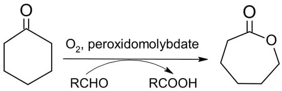 Scheme of catalytic Baeyer–Villiger (BV) cyclohexanone oxidation with molecular oxygen and peroxidomolybdates as catalysts.