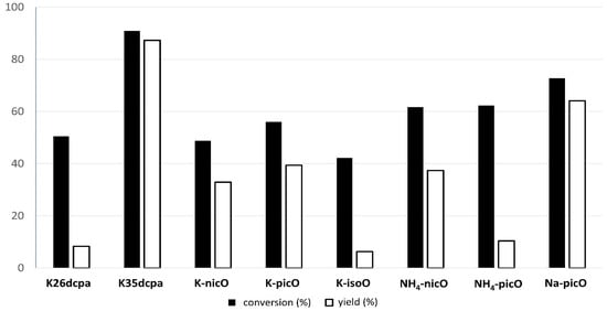 The highest conversion degree was observed for K35dcpa sample (90.9%), which was characterized by the highest yield of the reaction (89.7%) and the highest TON value (412.62) in the first run. In addition, for this compound the results of the second run were equally high. It is interesting that compounds with N-oxide bonds (N → O-Mo) have higher catalytic activities than compounds with N-Mo bonds (K35dcpa is more active than K26dcpa). Na-picO was second: Conversion (73.5%), yield (62.3%), and TON (286.58). This compound was the best in the group containing monocarboxylicpyridine acid. Detailed information about runs I, II, and III for selected compounds are presented in the Supplementary Materials, Section S4. Catalytic parameters for subsequent reaction runs are quite stable, which makes them promising objects for further tests.