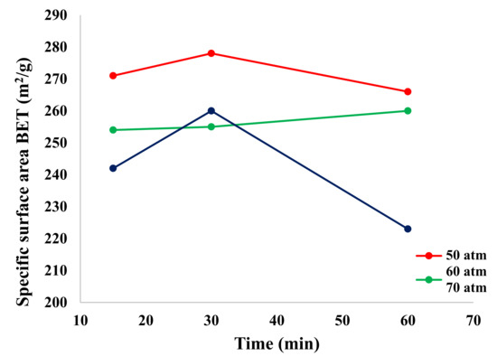 Figure 3 shows the dependence of the specific surface area (BET) as a function of process time and pressure. It can be observed that the highest value was achieved for the sample obtained in the 30 min process at a pressure of 50 atm. As the pressure and process time increased, the value of the specific surface area decreased. This is particularly evident for samples obtained at 60 min of process time. This was significantly influenced by lowering the process temperature, increasing the pressure and using microwaves, which also shortened the process time. Based on the literature review [6,7,8,12,13,14,15,20,21], it can be noted that previous studies carried out the synthesis of ZnAl2O4 in the temperature range from 600 to 900 °C. At those temperatures, a product with a small specific surface area and, consequently, a large grain size was obtained.