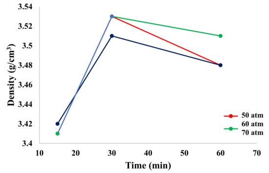 Figure 4 shows the dependence of density on pressure and process time. It can be observed that with an increase in these parameters (up to 30 min), the density increased, while after this time, it decreased.