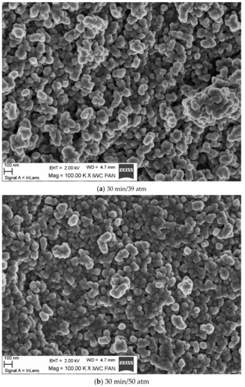 Analysis of the morphology using a scanning microscope showed that the reaction product agglomerated as beads (Figure 5). These structures were composed of fine crystallites that were attracted to each other in the reaction slurry or during post-synthesis washing. The morphology of the powders observed with a transmission microscope (TEM) enclosed fine grains (below 10 nm). We concluded that the higher the process pressure, the smaller the grains. The finest grains were observed for powder obtained at a pressure of 70 atm and a time of 30 min.