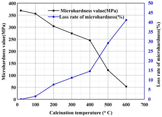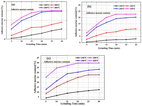 - The calcining-grinding method can effectively separate the recycled aggregate and attached old cement mortar. The calcination temperature below 100 °C had no great influence on the aggregate. When the temperature was 400 °C, the microhardness decreased to 245 MPa, and the hardness loss rate was 14.6%. The hardness of the aggregate had been damaged. Combined with the quality change of different-class recycled coarse aggregate and the microhardness loss of the aggregate under high temperature, the appropriate calcination temperature for the class I, II, and III recycled coarse aggregate was determined as 400 °C and the optimum grinding time was 20 min.