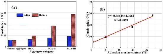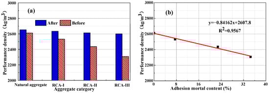 - The measured attached mortar contents of classs I, II, and III recycled coarse aggregates were 7.9%, 22.8%, and 39.7%, respectively, by calcining-grinding technology. Meanwhile, the water absorption, apparent density, and crush index had a good linear relationship, and the established linear relationship could accurate measure the content of the RCA adhesive mortar on the surface, which can directly reflect the internal defects of RCA.